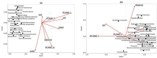 Redundancy analysis (RDA) is commonly used in ecology to analyse the relationship between a biological community and its environment []. In this study, we selected 24, 32, 29, and 24 species of birds separately for RDA during summer, autumn, winter, and spring, and the selected species had an appearance frequency of ≥20% in each river section. Then, we used the four seasons in the bird species matrix and the four seasons in the environmental factor matrix as the input for RDA and analysed the relationship between river wetland bird communities and environmental factors by season. The results were represented as a double-sequence diagram that demonstrated the relationship between species and environmental factors. Then, we made an lg (x + 1) conversion for the environmental parameters to let it tend towards a normal distribution and to eliminate the influence of extreme species richness values on the classification scores. We reduced the weight of rare species, allowing the research to focus on highly abundant species.