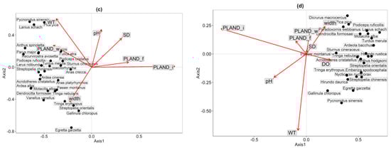 The correlation analysis between axis1 and axis2 indicated that the environmental factor PLAND_i predominated during summer (p < 0.01), with a significant impact on bird community diversity (Figure 2a; Table 3). The correlation analysis between axis1 and axis2 indicated that the environmental factors PLAND_i (p < 0.01), distance (p < 0.01), and pH (p = 0.031) predominated during autumn, significantly impacting bird community diversity (Figure 2b; Table 3). The correlation analysis between axis1 and axis2 indicated that the environmental factor PLAND_i (p < 0.01) and WT (p < 0.01) predominated in winter, with a significant effect on bird community diversity (Figure 2c; Table 3). The correlation analysis between axis1 and axis2 indicated that the environmental factor PLAND_i predominated in spring (p = 0.018), impacting bird community diversity (Figure 2d; Table 3).