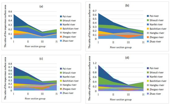 Trends in the urbanisation intensity of the different river section groups during each season. The coloured area denoting each river section in the figure represents the urbanisation intensity of that section. (a) Summer; (b) Autumn; (c) Winter; (d) Spring. I: river section group I; II: river section group II; III: river section group III; IV: river section group IV.