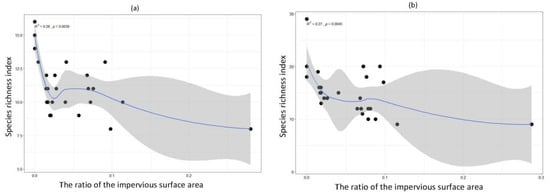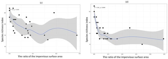 The urbanisation threshold can be estimated from the impervious-surface-area-ratio–bird-diversity-index graph, Threshold Indicator Taxa Analysis, or Locally Estimated Scatterplot Smoothing (LOESS). ‘LOESS’ is a non-parametric method involving locally weighted regression analyses, in which samples are divided into small intervals and polynomially fitted to each interval. The process is repeated to obtain weighted regression curves for each different interval, and the complete regression curve is synthesised at the centre of the individual regression curves []. Therefore, the ‘LOESS’ can help us calculate an urbanisation threshold when analysing the effect of urbanisation intensity on bird diversity. The response mode of river ecological indicators to urbanisation intensity can be roughly divided into three models: linear, buffer, and exponential. Of these, the exponential model is the best recognised.
