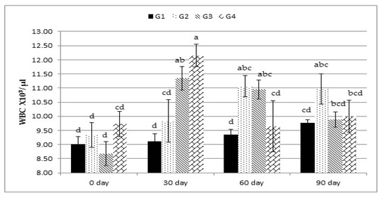 Effect of treatment (G1: 0, G2: 0.5, G3: 1, and G4: 2 kg of Calfo Care/ton DM diet) by time interacion (days 0, 30, 60, and 90) on white blood cell count (WBC) of Ossimi lambs. a–d: Mean values with different superscripts are significantly different (p ≤ 0.05).