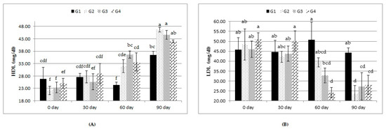 As shown in Table 6, neither treatment nor treatment-by-time interaction affected concentrations of blood serum TLs, CHO, and TGs. LDL showed lesser (p ≤ 0.05) values with the G2, G3, and G4 rations than with the G1 ration. Moreover, there was a nonsignificant increase in the concentration of HDL in all the experimental groups. All treatments significantly increased the overall mean of blood serum HDL and decreased blood serum LDL compared to the control. The treatment-by-time interaction revealed that these changes were significant at days 60 and 90 days compared to those at 0 and 30 days (Figure 2).