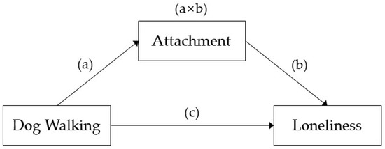 The data derived from the questionnaire were systematically coded and analyzed using IBM SPSS v.25 (IBM Corp., Armonk, NY, USA). Chi-square analyses were used to determine the difference in attachment level according to participants’ gender and the frequency of dog walking. The frequency dataset was dichotomized into two groups—“once a day or more” and “less than once a day”—to verify the statistical significance of the differences between the two groups. Multiple linear regression analyses were used to determine the association between dog walking, attachment, and loneliness. Before the regression analysis, a Pearson correlation analysis was performed to examine the correlation between variables. We expected that the relationship between dog walking and loneliness might be mediated by attachment (Figure 1). We did so following the prescriptions of Zhao, Lynch, and Chen (2010), who provided an updated procedure versus the traditionally employed Baron and Kenny (1986) mediation testing procedure [29,30]. First, we expected that dog walks would significantly impact loneliness (Path c). Second, we needed to verify whether dog walking is associated with attachment (Path a). Third, attachment should affect loneliness (Path b). Fourth, when loneliness is predicted by combining dog walking and attachment (Path a × b), and if dog walking does not affect loneliness, it can be called complete mediation. Paths a, b, c, and a × b were calculated using linear regression. The significance of the mediator (attachment) was verified using the Sobel test. Finally, we used model 4 of Hayes’ (2013) PROCESS macro for SPSS version 4.0 to examine the mediating role of dog attachment between dog walking and loneliness [31]. In the model we ran, indirect effects were subjected to bootstrap analyses with 5000 bootstrap samples and a 95% confidence interval. A significant indirect effect is considered to have emerged if a bias-corrected bootstrap 95% confidence interval for the product of the paths excludes zero [32].