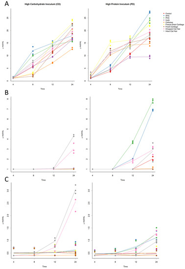 As the triplicate measurements at each sampling time point were taken from the same faecal inoculum, they are pseudoreplicates from the same inoculum rather than true biological replicates. However, this is a common limitation that in principle applies to most culture experiments [32]. To better represent the true population, more faeces from more cats would be required. However, previous in vitro studies also used a pooling technique from a limited number of animals (2–4 faecal samples) [9,27,33,34]. More recently, Bosch, et al., [35] studied the impacts of the number of faecal samples and donors, and observed that the degree of inter-individual variation was dependent on the complexity of the substrate.