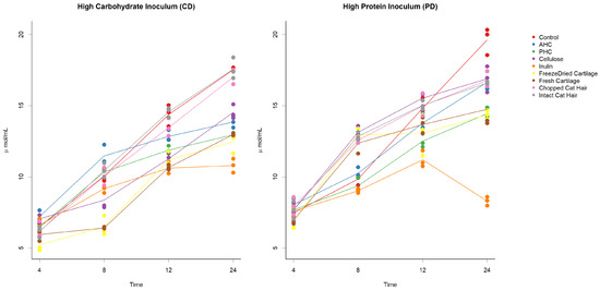 (A–C). Scatter plots with mean lines of (A) acetate (B) butyrate and (C) propionate concentrations. Time (hours) is along the x-axis and organic acid concentration along the y-axis (µmol/mL). Each graph depicts both high protein faecal inoculum (PD) and high carbohydrate faecal inoculum (CD) and the changes that occurred over 24 h of fermentation. Each point (coloured circle) represents an individual replicate, and each line shows the mean for each substrate. Control samples are denoted by a red line, AHC (ANZCO hydrolysed collagen) by a blue line, PHC (Peptan hydrolysed collagen) by a green line, cellulose by an orange dashed line, inulin by a purple line, freeze-dried cartilage by a yellow line, fresh cartilage by a brown line, chopped cat hair by a pink line, and intact cat hair by a grey line.