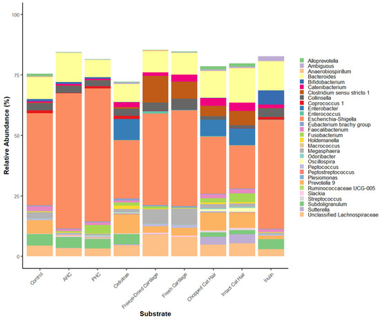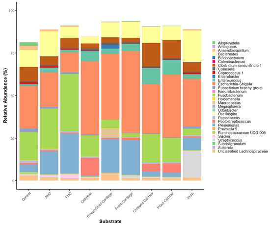 The effect of the substrate on the culture microbial community varied according to the source of the faecal inoculum (Figure A1). Two-way permutation ANOVA of 76 taxa with substrate and inoculum type as factors showed that both these factors had large effects on the microbial community with significant interactions between substrate and inoculum source (FDR < 0.05). Of these 76, taxa with relative abundance <1% across all substrates were filtered out for the purposes of displaying using bar plots, leaving 30 dominant taxa across all samples (Figure 3). Fusobacterium was the most dominant genera in AHC (23%) and PHC (33%) samples (Figure 3). Escherichia–Shigella was the most relatively abundant taxa (>20%) present in all other substrates (Figure 3). Chao1 alpha diversity assessment observed significant differences between the substrates (p = 0.012; Figure A2).