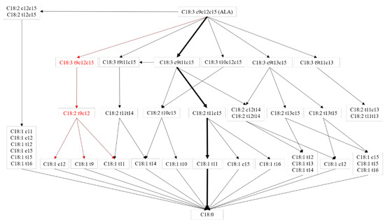 ALA biohydrogenation pathways in the rumen. Adapt from [4]. Red line pathway: reported in this experiment; black line pathway: reported by previous study; black bold line pathway: main biohydrogenation pathways in the rumen.