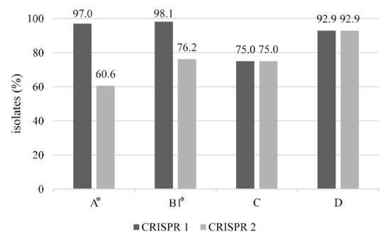 Distribution of CRISPR 1 and CRISPR 2 by phylogenetic group in 164 E. coli possessing virulence genes, isolated from bulk tank milk. The asterisk indicates that there were significant differences between CRISPR 1 and CRISPR 2 (p < 0.05).