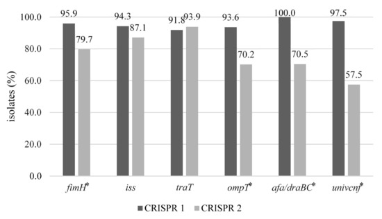 Distribution of CRISPR1 and CRISPR2 by virulence gene in 164 E. coli possessing virulence genes, isolated from bulk tank milk. The asterisk indicates that there were significant differences between CRISPR 1 and CRISPR 2 (p < 0.05).
