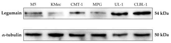 In the original Western blot analysis (Figure S1), there were two bands in the M5, KMec, CMT-1, and MPG cell lines, since, in UL-1 and CLBL-1 cell lines, this does not happen. Besides, there is a positive signal in the near 75kDa band. To our best knowledge, this is the first study to investigate legumain expression in canine tissues; we cannot find any clues why there are variations among the different cell lines. One of our possible speculations for the 75kDa band may be the different legumain isoforms. From the NCBI protein database, at least nine isoforms were recorded (while it seems only three complete isoform amino acids were shown with the corresponding molecular weight around 50 kDa). Therefore, we hypothesize the 75kDa band might be one of the isoforms while more data are needed to verify the hypothesis. However, for the antibody we used in this study, the immunogen is the partial amino acid sequence of human legumain. This sequence identity between human and canine species is 91% to prove this antibody could specifically react with canine legumain.