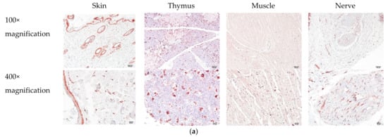 To probe the primary antibody that would identify the normal tissues in dogs, we examined IHC in normal tissues as the control groups. The expression levels were shown as relatively negative signals of the whole figures. Figure 2a shows that there was no significant signal of legumain in the stroma of normal tissues, including the skin (Figure 2b, 3.44% ± 0.68%), thymus (Figure 2b, 7.88% ± 0.31%), muscle (Figure 2b, 0.67% ± 0.19%), and nerve (Figure 2b, 4.14% ± 0.49%) tissues. Of note, in the epidermis and in hair follicles, histiocytes demonstrated moderate-to-strong cytoplasmic legumain positivity, but the muscles, fibroblasts, and lymphocytes showed weak-to-moderated cytoplasmic immune expression.