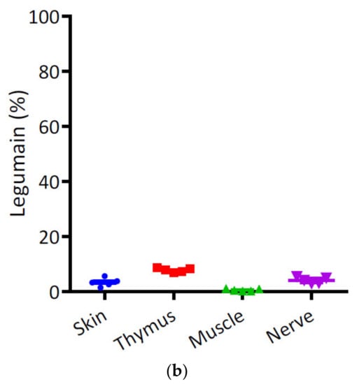 Expression patterns of legumain in canine normal tissues. Relatively low expression levels of legumain in these tissues, including (a) representative samples of the skin, thymus, muscle, and nerve. (b) Statistical analysis of legumain expression among different tissues. All data are expressed as mean ± SEM (n = 5).