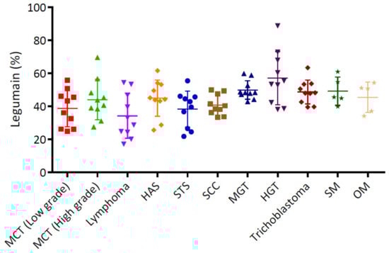 A total of 50 cases, distributed in four types of tumors (MCT, lymphoma, HAS, and STS), belonged to the mesenchymal-type tumor, with an average legumain expression of 40.07% ± 1.70%. Epithelial-type tumors, including SCC, MGT, HGT, and trichoblastoma, had significantly higher legumain expressions (on average, 49.12%; SEM, 1.75%) compared to mesenchymal-type tumors (Figure 6, p = 0.0177). The average expression of 47.35% ± 2.71% in melanomas was significantly higher than that in mesenchymal-type tumors (Figure 6, p = 0.0284). These results indicate that legumain is overexpressed in tumors, especially in non-mesenchymal-type tumors.