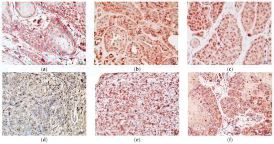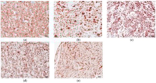 The statistical analysis revealed that the expression percentages of legumain were significantly higher in all tumors (Figure 3) than in the normal tissues (Figure 2). Based on the source of tumor differentiation, we further divided these tumors into three groups: mesenchymal tumors (MCT, lymphoma, HAS, and STS), epithelial tumors (SCC, MGT, HGT, and trichoblastoma), and melanomas. The statistical analysis is summarized in Figure 3, and the representative figures of the tumors are separately provided in Figure 4 and Figure 5. Low-grade (Figure 4a) and high-grade MCTs (Figure 4b) expressed positive signals of 38.73% ± 3.51% and 44.05% ± 3.86%, respectively, without a significant difference (p > 0.05). In lymphoma cases, legumain expression was 34.23% ± 4.31% (Figure 4c). Legumain expression was observed in the cytoplasm of these round cell tumors (MCT and lymphoma). The low-grade MCTs exhibited majorly diffuse cytoplasmic patterns but occasionally exhibited vesicular patterns. In contrast, the high-grade MCTs and the lymphomas exhibited majorly vesicular and diffuse patterns. Notably, numerous neoplastic cells of the high-grade MCTs and lymphoma had occasionally moderate nuclear staining. HAS (Figure 4d), and STS (Figure 4e) had positive signals of 44.95% ± 3.49% and 38.38% ± 3.46%, respectively. The immunopositivity of legumain was also located in the diffuse cytoplasm, while STS exhibited weak vesicular positivity. The immunopositivity of legumain was also located in the diffuse cytoplasm, while STS exhibited occasionally vesicular positivity. SCC (Figure 5a) and MGT (Figure 5b) had legumain expression signals of 40.83% ± 1.95% and 49.89% ± 1.78%, respectively. Among all the samples, the HGT (Figure 5c) had the highest expression level of legumain at 57.09% ± 5.10% in the tumor sections. Trichoblastoma (Figure 5d) had a legumain signal of 48.68% ± 2.28%. SCC and MGT exhibited vesicular and diffuse patterns. The HGT and trichoblastoma exhibited majorly diffuse and tiny dotted, but occasionally vesicular, patterns. The stomal cells of these tumors exhibited almost negative signals. Oral melanoma (Figure 5e, 49.21% ± 3.80%) and skin melanoma (Figure 5f, 45.49% ± 4.11%) had no significant differences in legumain expressions. Both these melanomas exhibited strongly vesicular cytoplasmic positive signals. In summary, legumain is overexpressed in tumors; however, no significant differences in the expression of legumain were found among the ten types of tumors. To probe the possibility of different patterns among mesenchymal-type cancers, epithelial-type cancers, and melanomas, we further analyzed the expression levels among these groups.