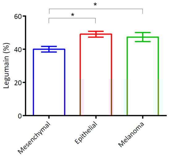 Statistical analysis of legumain expression among three tumor types. Legumain expressions in melanoma and epithelial tumors were higher than those in mesenchymal tumors. All data are expressed as mean ± SEM. Statistical significance was calculated with the Kruskal–Wallis test. * p < 0.05.