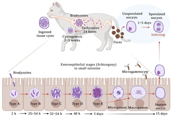 Toxoplasma gondii is well-studied because of its medical and veterinary importance. T. gondii is an intracellular parasite, a widespread zoonotic protozoan, which infects all warm-blooded animals [1]. T. gondii can be transmitted by a fecal-oral cycle, transplacentally, and by carnivorism. Members of the Felidae are the only known definitive host that supports sexual multiplication and sheds infective oocysts into the environment [2,3]. There are three stages of T. gondii that are infectious for all hosts: tachyzoites, bradyzoites, and oocysts [4,5]. When an intermediate host consumes the oocysts, the tachyzoites spread from the oocysts and become a rapidly replicating stage in the acute infection. Toxoplasmosis may cause by the tachyzoites in the intermediate host. The immune system does not eliminate tachyzoites, and some of them convert to the slowly growing bradyzoite stage stored in the brain, muscle, heart, and other tissues of the intermediate host [6]. Bradyzoites, which are in a slow replication stage, are contained in tissue cysts and establish a chronic infection, demonstrating a balance between host and parasite. After being consumed by felids, bradyzoites enter the enteroepithelial cells of felids and enter the sexual stage. Enteroepithelial stages (Figure 1) of T. gondii (types A, B, C, D and E) occurs only in felids, resulting in the formation of immature oocysts [7]. Unsporulated oocysts are shed in the felids’ feces for approximately 2 weeks. After shedding, parasite oocysts take 1–5 days to sporulate in the environment and become infective [8].