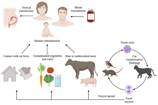 Recently, T. gondii was found to cause neurological symptoms in many species. Clinical signs are rare in infected cats, but clinical toxoplasmosis has been documented in some immunosuppressed cats [9]. T. gondii would abolish the innate fear response of rats for the odor of cat urine, converting this aversion to an attraction [10,11]. This may increase the likelihood of a cat predating a rat and increase parasite transmission through the trophic route. In wild animals, cubs of hyena (Crocuta crocuta) infected with T. gondii were closer to lions and had a higher mortality rate than uninfected hyenas [12]. California sea otters (Enhydra lutris nereis) with toxoplasmosis may be prone to shark predation [13]. In meat-producing animals, tissue cysts of T. gondii were observed in infected pigs, sheep, goats, poultry, pigeons, farm deer, game animals (including hares and birds), domestic rabbits, dogs, horses, buffaloes, cattle, chickens, ducks, camels and equines (reviewed in [14,15]). Tachyzoites of T. gondii were detected in raw chicken eggs and the milk of sheep, goats, cows, and donkeys (reviewed in [15,16]). Currently, an estimated 2 million people globally are infected with T. gondii [17]. The parasite transmission can occur by consuming raw or undercooked meat containing tissue cysts, ingesting food or water contaminated with oocysts, or direct contact with oocysts shed in cat feces (Figure 2). Due to the increasing population of cats, this might present a significant exposure risk of humans and other animals. Cases of clinical toxoplasmosis in wildlife have been discovered in wild rabbits, squirrels, canaries, finches, deer, bears, raccoons, lemurs, squirrels, monkeys, and marmosets (reviewed in [16]). Toxoplasmosis is considered to be an emerging disease that can cause mortality, abortion, and decline in wildlife populations.