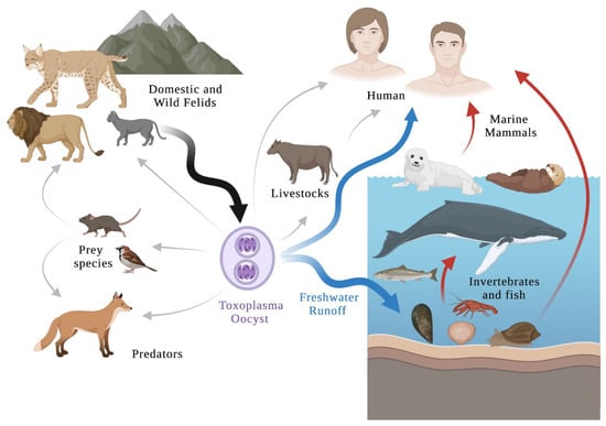 A route of T. gondii oocyst-induced transmission. Domestic and wild felids are the only known source (black arrow) of T. gondii oocysts. The environmental resistant oocysts can be transported in freshwater runoff (blue arrow). The possible infection routes of terrestrial (gray arrows) and marine species (gray arrows) may be exposed directly to oocysts or indirectly through food sources. Schematic based mainly on https://counterbite.wordpress.com/2019/09/28/cats-and-the-ecosystem/, accessed on December 2021.