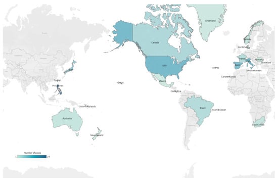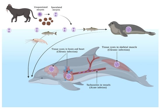T. gondii or T. gondii-like protozoan parasite exposure have been reported in numerous cetacean species (Table 1) (reviewed in [27,31,32,33,34]). These cases were recorded in certain regions, including North America, Western Europe, and Oceania (Figure 4). The asexual stage of T. gondii begins after the ingestion of oocysts or the tissue cysts (Figure 5). Studies demonstrated that the toxoplasmosis lesions in cetaceans were non-suppurative meningoencephalitis and choroiditis, lymphoplasmacytic perivascular cuffs, gliosis, neuronal degeneration, necrosis, abortion, and may lead to a decline in health, contributing to stranding and mortality events [25,35,36,37]. Reproduction and population health effects can be huge for threatened populations. Besides, Toxoplasma gondii-associated encephalitis was exacerbated by coinfection with Brucella spp. and Listeria monocytogenes in a wild striped dolphin (Stenella coeruleoalba) from Italy [38].