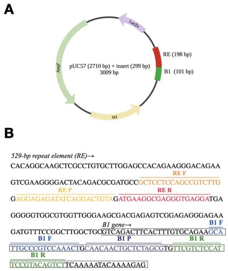The sequence of synthetic spike-in standard as shown in figure (Figure 6A,B). The synthetic spike-in standard contained a fragment of the B1 gene (GenBank accession no. AF179871) [44] and a fragment of the 529-bp repeat element (RE) (GenBank accession no. AF146527) [45] of T. gondii. They were synthesized on the basis of the pUC57 plasmid (Biotools, New Taipei, Taiwan).