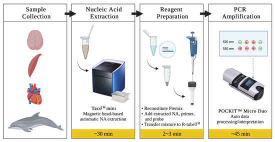 POCKIT™ GeneReach, Lexington, MA, USA) (system workflow for point-of-need detection of T. gondii synthetic spike-in standard. This system includes a compact automatic nucleic acid extraction device (taco™ mini) and a portable PCR device (POCKIT™). After sample collection, nucleic acids are extracted using a preloaded extraction plate in approximately 30 min. Subsequently, the lyophilized iiPCR reaction is reconstituted, and nucleic acids are added and tested. The mixture was transferred to an R-tube and tested in a POCKIT device. TaqMan® probe hydrolysis-based amplification signals are detected and automatically processed, providing qualitative results on the display screen after 45 min. One to four reactions could be performed simultaneously in one run. Schematic based mainly on Carossino et al., 2017.
