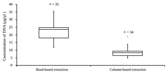 The boxplot of concentration of DNA showed the median (line), Q1 and Q3 percentiles (box), 1.5 interquartile range (whiskers) and outliers (red asterisks). The Q1 of bead-based extraction was 18.0 μg/μL and Q3 was 24.8 μg/μL. The Q1 of column-based extraction was 6.4 μg/μL and Q3 was 9.4 μg/μL.