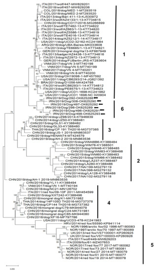 - Niu, L.; Wang, Z.; Zhao, L.; Wang, Y.; Cui, X.; Shi, Y.; Chen, H.; Ge, J. Detection and molecular characterization of canine circovirus circulating in northeastern China during 2014–2016. Arch. Virol. 2020, 165, 137–143. [Google Scholar] [CrossRef]