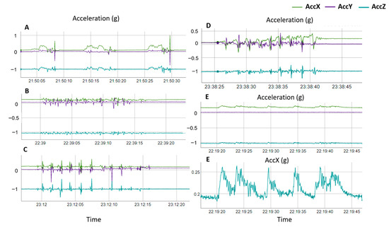 Acceleration signals corresponding to the five behavioral categories of nesting green turtle: Digging (A); Covering (B); Sand-sweeping (C); Walking (D); and Egg laying (E). We also represent the X-axis of the acceleration of Egg Laying. AccX corresponds to acceleration of the back -to-front body axis, AccY to the left-to-right axis and AccZ to the bottom-to-top axis.