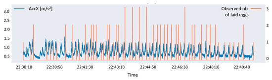 Visualization of the surge acceleration axis (back-to-front or X-axis, in blue) of one green turtle associated with the number of laid eggs counted in the field (in orange).