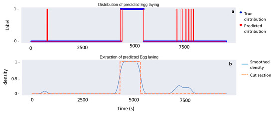 Representation of each step of the extraction of the Egg laying period from the predictions of the V-net for the individual #11. The first panel (a) shows the true distribution of Eff Laying over time compared to the predicted distribution by the V-net. The second panel (b) shows the smoothed signal of the predicted distribution while the orange dashed line represents the automatically extracted Egg Laying period from which the number of eggs laid is estimated.