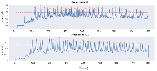 Visualization of the surge acceleration axis (back-to-front or X-axis, in blue) of the laying process of two green turtles with the peaks detected from a rolling window with width of 200.