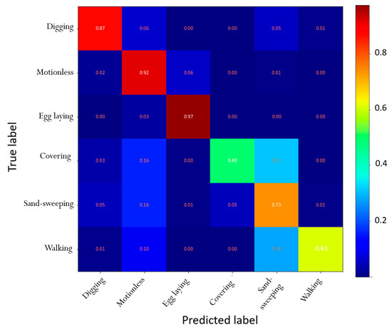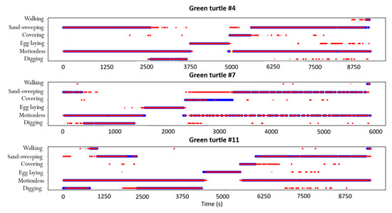 The main confusion from the V-net concerns Covering and Sand-sweeping. The visualisation of the activity budget shows that this misclassification appears between the end of Covering and the beginning of Sand-sweeping. This confusion is mainly due that nesting turtles express rear flipper sweeping movements in the two stages [28]. In fact, Covering ends with rear flipper sweeps consecutively to rear knead movements, while the following Sand-sweeping stage begins with simultaneous both rear and front flipper sweeps and is characterised by sweeps of the front flippers alone at the end. Nishizawa and al. [23] also obtained the lowest Recall index associated with Covering. Confusions on behavioral identification from supervised learning algorithms were also revealed on other species for which different behaviors encompass similar mechanistic movements [32,33,34]. More generally, the automatic behavioral identification from accelerometer are based on the animals’ posture and the movements and thus requires the precise definition of the behavioral categories based on these, rather than the function or action of the behaviors. In our case, a more precise identification and annotation of the movements involved in Covering and Sand-sweeping in the field (such as ‘rear flipper sweeping’, ‘front flipper sweeping’ and ‘covering’) would probably improve the precision of the V-net for those two behaviors. However, the main challenge in remote monitoring of sea turtles during the breeding season is to detect the egg laying process because in marine turtles, and more markedly in green turtles, individuals come ashore several times in the same night before laying eggs [10,15]. This is why it is important to detect with certainty if the turtle has laid eggs or not and to understand the reasons for these U−turns. Our study allowed us not only to detect the six behavioral categories of the nesting process, but also a more accurate detection of the Egg laying process by the V-net (Recall index = 0.97).