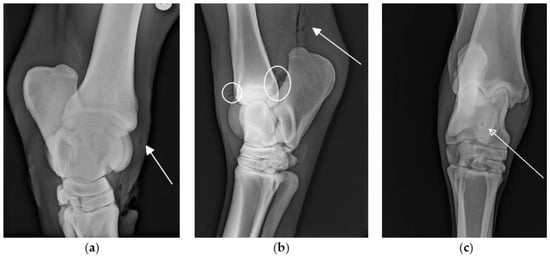 Diagnostic imaging, primarily radiography and ultrasonography, was performed in the majority of cases and assisted in correctly diagnosing SI but were not reliable methods to exclude synovial penetration entirely. Changes seen on radiographs when SI is detected later in the disease process include joint space collapse, osteitis, osteomyelitis, and calcification of periarticular tissues []. These changes are not usually seen radiographically in adult horses until at least 14 days post injury [] but baseline radiographs can help to distinguish possible signs of progressive infection from the pre-existing pathology []. Faster progression of radiographic changes has been described in association with certain bacterial isolates, e.g., Staphylococcus aureus, and may be associated with a decreased prognosis [].