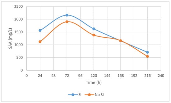 SAA is an acute phase protein with values increasing rapidly in the systemic circulation in response to inflammation and infection []. It has been reported to increase in cases of SI [,], which was also seen in our study. Total blood SAA concentration did not differ between horses with or without SI at any time point, with an increase of at least 200 mg/L between the first and second measurement indicative of SI.