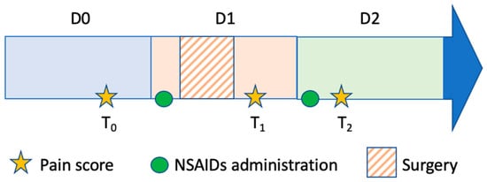 Study protocol. NSAID was administered 1 h before surgery and 24 h later. Pain scores were assessed before NSAID administration (T0), after recovery from anesthesia (T1) and after the second NSAID administration (T2).