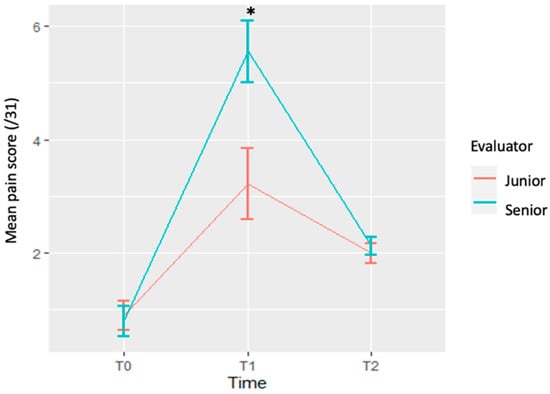 Comparison of pain scores assessed from a specialist (senior) and a veterinary student (junior). Data reported as the mean and SEM. * Significant difference between scores from senior and junior (p 0.05).