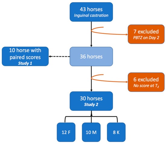 Flow diagram of group designation of horses after exclusion. PBTZ: phenylbutazone; F: flunixin meglumine; M: meloxicam; K: ketoprofen.