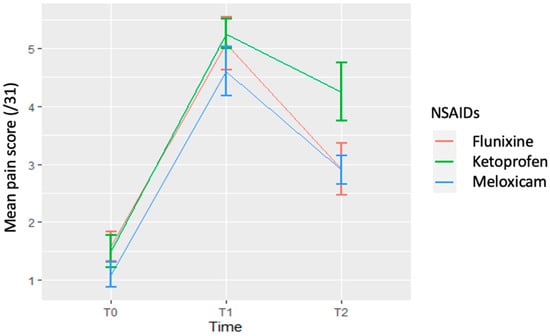 When taking into account the simultaneous effect of time and NSAID on pain scores, there was no time–NSAID interaction. When comparing the mean pain scores of each NSAID without taking time into account, there was no significant effect of NSAIDs on pain scores, even though a less marked decrease in pain score was observed at T2 with ketoprofen than with flunixin and meloxicam. When comparing mean pain scores with time without taking NSAIDs into account, there was a significant time effect, with pain scores at T1 being significantly greater than at T0 and T2 (p < 0.0001 and p < 0.000126, respectively) (Figure 4).