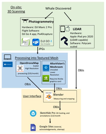 The data workflow that was used to generate a virtual necropsy experience from a stranded whale. After the whale was initially discovered, it was three-dimensionally scanned using both photogrammetry and light detection and ranging (LiDAR). While LiDAR software Polycam generated OBJ files in the field, photogrammetry produced ordered JPG files that were later assembled into a textured mesh using both OpenDroneMap and AliceVision®’s Meshroom. All OBJ files could then be further processed, edited and measured in Blender. Ultimately, these edited OBJ files were uploaded to the Sketchfab website. Within Sketchfab, annotations were added to provide logical navigation with the different scans and additional links to resources stored on Google Drive. Finally, a Google site was created to provide the context for the virtual necropsy experience including educational resources, a brief video user tutorial, and a site map with quick links to different aspects of the necropsy (main necropsy home: https://sites.google.com/alaska.edu/virtual-necropsy/home (last accessed on 15 February 2022); necropsy workshop home: https://sites.google.com/alaska.edu/virtual-necropsy-workshop/home) (last accessed on 15 February 2022). Here, “scaling” refers to scaling in absolute units. All digital reconstructions had the x, y, and z axes properly scaled relative to each other.