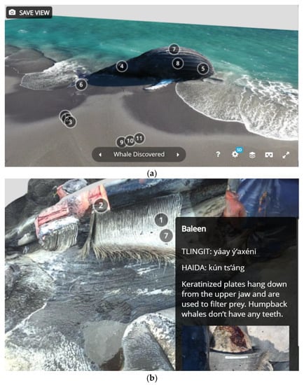 The scans were then ordered and linked via the annotation capability of the Sketchfab platform. A whale researcher who was present on site for the necropsy and a veterinary pathologist collaborated to interpret the information presented for both users without basic knowledge of whale biology as well as research professionals. In addition to providing interpretive information, these annotations also provided external links to resources such as photographs of the necropsy, research papers, and government websites. Annotation topics included practical information (e.g., what to do if you find a dead marine mammal), whale internal and external anatomy and physiology, marine adaptations, diagnostics (including signs of trauma, histology, sample collection, and parasitology), and cultural information specific to the Tlingit, Haida, and Tsimshian Indigenous peoples of Southeast Alaska [20,21,22]. In some cases, additional information from other necropsies was provided with permission, to demonstrate additional presentations of pathology or trauma not visible with this whale or in the scans obtained.