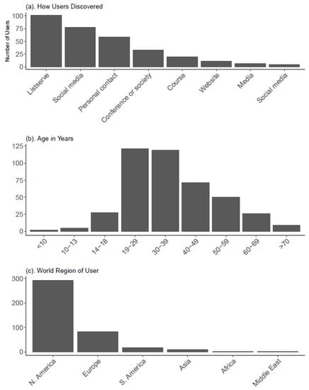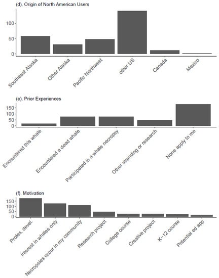 As of 18 December 2021, the virtual necropsy has been publicly available for one month. There were 485 user responses received, with 90.7% responding that they were first-time users. In the first month of availability, our 4D virtual necropsy was accessed over 400 times from 37 countries or territories (Figure 3). The users most commonly cited a listserve in the way they learned about the virtual necropsy. The virtual necropsy was submitted to the popular Marmam listserve [23]. The users were most commonly between 18 and 40 years old that tended to coincide with higher education levels and users earlier in their careers. Accordingly, professional development was the most common motivation for accessing the necropsy. However, the second most common motivation was just general interest. A general audience was also reflected in a large number of users from Southeast Alaska or who noted that whale necropsies occur in their communities. Other common motivations included taking a course, research applications, other creative projects, or an interest in potentially using the necropsy as an educational resource in the future. This group included K-12 educators, outreach specialists, university professors, and stranding coordinators.