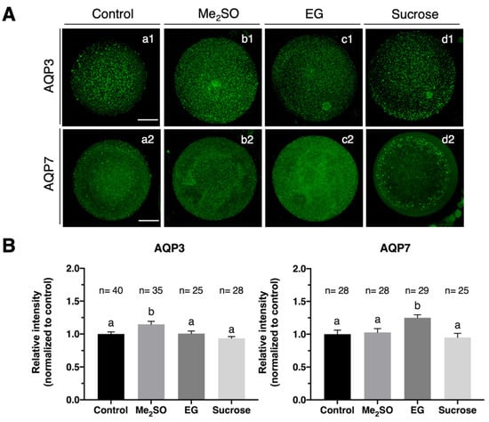Effect of the exposure of IVM bovine oocytes to hyperosmotic CPA solutions on the levels of expression of AQP3 and AQP7. (A) Immunofluorescence analysis of AQP3 and AQP7 expression in bovine oocytes without treatment (a1 and a2, respectively) and in the presence of 9.5% Me2SO (b1 and b2, respectively), 8% EG (c1 and c2, respectively) or 0.5 M sucrose (d1 and d2, respectively). The concentrations of the two penetrating cryoprotectants, EG and Me2SO, were chosen to prepare solutions with similar osmolalities, as previously indicated []. AQP3 and AQP7 protein expression is displayed in green. Scale bar, 30 μm. (B) Summary data of the relative immunofluorescence intensity normalized to control. Data are presented in arbitrary units ± SEM, n ≥ 25, a,b Different letters indicate statistically significant differences between treatments (p < 0.05).