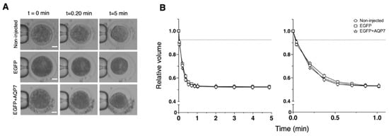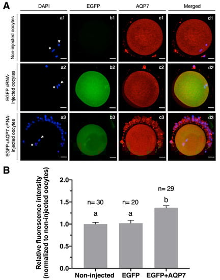 Due to the similar expression efficiency of AQP7 and EGFP in bovine oocytes, only those AQP7 cRNA-injected oocytes that co-expressed EGFP were chosen for the permeability studies [].
