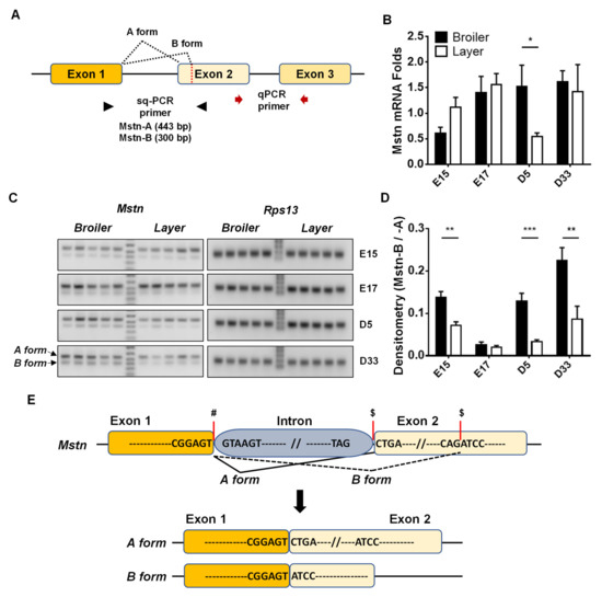 Comparisons of the expression levels of myostatin (Mstn) isoforms in broiler and layer chickens. (A). The schematic diagram shows the location of specific primer sets for qPCR and sqPCR of the chicken Mstn gene. (B). Quantitative analysis of the Mstn expression levels during development by qPCR (n = 5). (C,D). Gel electrophoresis of sqPCR products of Mstn and densitometry analyses. sqPCR products were separated by gel electrophoresis and the densitometry analyses (ratios of Mstn-B form to Mstn-A form) were performed using NIH ImageJ software. Rps13 was used as an internal control for qPCR and sqPCR. The multiple t-test was used for statistical analysis of the broiler and layer chickens by the Graphpad PRISM 6.02 program. The values presented are means ± SEM (n = 5). *: p < 0.05, **: p < 0.01 and ***: p < 0.001. Abbreviations: E, embryonic day; D, postnatal day. (E). Alternative splicing (AS) events of Mstn and sequences of splicing junctions. #: alternative 5′ splice site, $: alternative 3′ splice site.