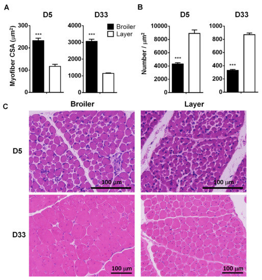 In the current study, CSA of the muscle fiber in broiler chickens was approximately 2.0 and 2.7 times greater compared to that in layer chickens at D5 (233 ± 11 vs. 117 ± 9 μm2, p < 0.001) and D33 (3058 ± 114 vs. 1148 ± 30 μm2, p < 0.001), respectively (Figure 2A,C). In addition, the fiber density per unit area was approximately 2.1- and 2.6-fold greater in the layer compared to the broiler at D5 and D33, respectively (broiler vs. layer: 4301 ± 197 vs. 8907 ± 525, p < 0.001 at D5, and 330 ± 14 vs. 871 ± 25, p < 0.001 at D33, (Figure 2B,C)), further confirming muscle hypertrophy in broiler chickens.