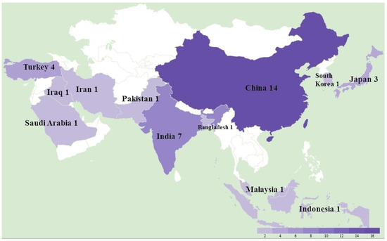 The study location and number of Marek’s disease outbreaks in Asia between 2011 and 2021.