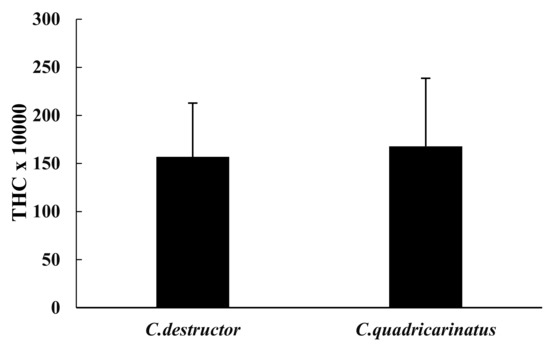 The total haemocyte count (THC) showed very similar values in both species (1.568 × 103 ± 560 × 103 in C. destructor and 1.678 × 103 ± 707 × 103 in C. quadricarinatus, Figure 1) and were not significant (p = 0.70).