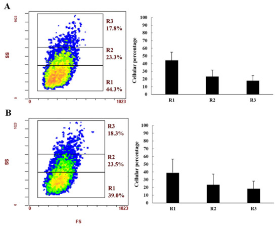 Three subpopulations of haemocytes were classified in both species according to cell complexity (SS) and cell size (FS) (Figure 2A,B). In detail, region 1 (R1) shows cells characterized by low complexity, region 2 (R2) are the more complex cells, and region 3 (R3) are the most complex cells. In both species, the percentage of haemocytes of the three regions is very similar. The highest percentage was observed for cells in R1, followed by R2 and R3 regions, respectively.