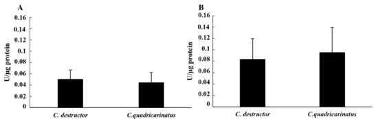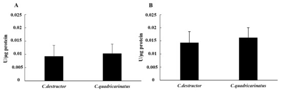Esterase activity (A) and alkaline phosphatase (B) activity in the cellular lysate of C. destructor and C. quadricarinatus are shown as mean ± SD.