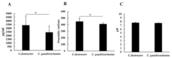 Total protein (A), osmolality (B), and pH values (C) in the haemolymph of C. destructor and C. quadricarinatus are shown as mean ± SD. (*p < 0.05).